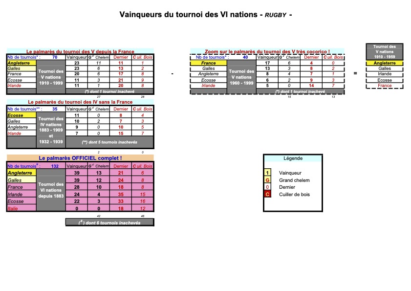 Soit 35 éditions sans elle qui ont donné des ailes au Pays de Galles et à l’Angleterre avec respectivement 10 et 9 titres en sus, sur cette période, offrant à ces deux nations officiellement le meilleur palmarès avec 39 sacres chacune.
